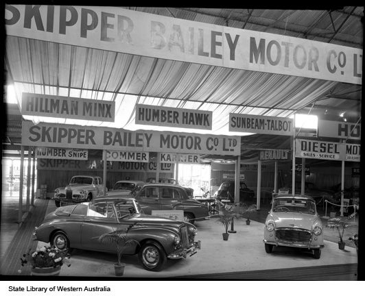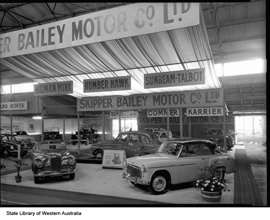 Title: Perth Royal Show display of Sunbeam Talbot, Humber Hawk and Hillman cars.